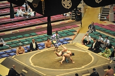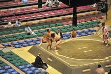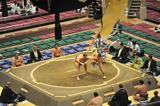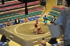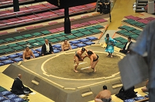 横綱武蔵丸の甥っ子、光武蔵は初土俵から数えて 5場所目、勝ち越しを続けて三段目に上がった。相手の千代太陽は100kgそこそこの細身の力士で、入門から 7年余り、本名の読みが千代鳳と同じ。 両者自己最高位の三段目51枚目。東の光武蔵が両手で突こうとすると西の千代太陽ふっと沈みながら正面側に飛んで足取り、忽ち光武蔵を西に倒す。 光武蔵はこの場所負け越し、一方の千代太陽は 3月から連続勝ち越し中、 9月も11月も勝ち越して三段目上位に進出である。