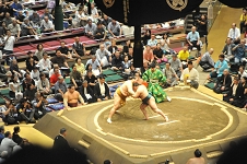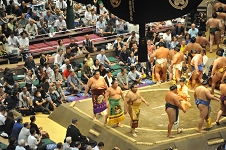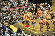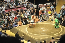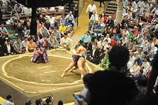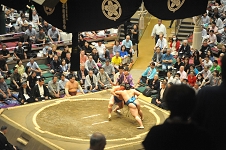 この日の十枚目最後の一番は、琴栄峰に欧勝海。欧勝海かまして左を入れると琴栄峰例によって仰け反りながら左下手を探り、指を掛けて左に廻ったが、 欧勝海左下手を引いて腕を返し、琴栄峰の左を切って右でおっつけ、琴栄峰が再度下手を引くと欧勝海なおもおっつけ、白房に攻め込んで完全に起こし、右上手を取っての寄り切り。 なかなかの力強さであった。