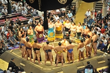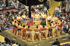 幕内力士の土俵入りは東から。初日から休んでいるのは尊富士だけで、例によって土俵上は大混雑。赤房下の竜電は右手を挙げるのにも窮屈そうにしている。 若隆景はうつみ宮土理から贈られた化粧廻しで登場。竜電がいた位置、西方力士は一山本が立っていたが、こちらは窮屈そうではない。 実際、東の方が 1人多くて、たかが 1人と言われても、されど 1人なのである。一山本の前には草野、 6枚目に躍進してきたが、大銀杏を結うにはもう少し時間が必要そうだ。