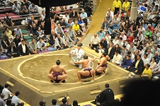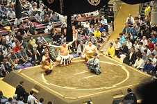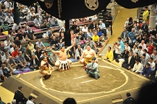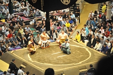 まずは塵浄水から。大の里の蹲踞は、いってみれば普通の蹲踞である。これは平成30年の稀勢の里がそうだったので、それを引き継いだということができる。 稀勢の里は、平成29年には凸型の蹲踞をしていて(最後の場所だった31年 1月は中間ぐらい)、大の里も新横綱の奉納土俵入りでは凸型でやろうとしたのだが、それは凸型よりもさらに腰高、 吉葉山みたいになっていた。殆ど立っているのではないかというような恰好の塵浄水は、時期にもよるが、千代の山・照國・羽黒山・玉錦あたりに見ることができる。 横綱力士を大きく見せるというのは頷けるにしても、蹲踞と呼べるのか?という疑問が拭えず、筆者は好むところではない。柏手の打ち方は稀勢の里に似ていて(但し稀勢の里は両腕を垂直に上げて止めていた時期もあったが、 大の里は止めない)、腕を大きく廻して(ただし肩より下には廻さない)力強く打つタイプ。一方の豊昇龍は、凸型の塵浄水で、踵を俵に乗せるタイプ。 近いところでは曙がそうで、曙は横綱昇進当初は普通の蹲踞だったが、数場所で凸型に変わっている。柏手の前の腕の廻し方は、 頭の横で腕を直角にして止めるタイプで、教えた武蔵丸がそうだったし、照ノ富士もその形(師匠の旭富士とは全然違った)。 しかし、豊昇龍は腕を止めたあと、水平いっぱいに伸ばしてから手を打つ。これは類例が思い浮かばない。両者とも、塵浄水の形は良いと思う。