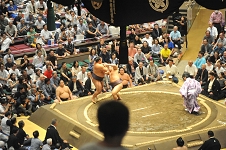 中入後取組 4番目、前場所右半身にたくさんの負傷を抱えた翔猿、写真で見ると派手な相撲だったように見えるが動きは実は慎重で、 湘南乃海の癖であるところの右への動きに崩れず、一度左腕を大きく上げられたが巧みに振りほどき、湘南乃海の高さにつき合わずに取った。