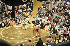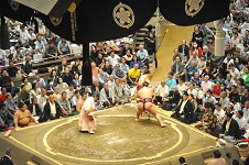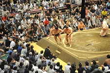 ![]() | ○明生(押し出し)時疾風● 時疾風左肩を出して左を差そうとすると明生左を固めながら額で当たって右前褌狙い、右は取れなかったが、すぐに左に引き落としを見せて揺さぶるや右喉輪で一突き、左で小さく張って額で当たり左差し右前褌狙い、白房に攻め入り、窮した時疾風が左を抜いて上手を求めると明生両手で脇腹を挟みつけて右に押し出した。 |
