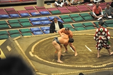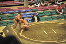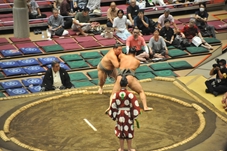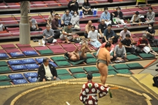 メンバーが揃って、時刻は 1時半。西には十枚目にいた竜虎の弟、竜翔が登場しているが、割紙を見ながら話していたのは、黒姫山がどんな相撲を取るかということ。 その相撲は12番後だ。竜翔の相手は千代ノ皇。両差し狙いの千代ノ皇を挟みつけ、次いで千代ノ皇が左から抱えて起こそうとすると竜翔頭を上げず右で下手前褌、 千代ノ皇無理矢理左おっつけで出ると竜翔左を巻き替え、千代ノ皇の左突き落としに乗じ黒房へ。