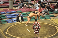 1番飛んで、東は日大出身の清水海。番附に載った昨年 7月、一番相撲で炎鵬を破ったことで名を売り、それから16連勝を記録したが、さすがに幕下で壁に当たり、 それを徐々に越えようとしているところ。右を差したかった清水海だが出羽大海の突っ張りで果たせず、攻めてくる出羽大海の左を引っ掛けて難を逃れる。 客のいない正面砂かぶりで出羽大海、遠慮なく豪快な転がり。足裏の砂を浴びた客が払っている。