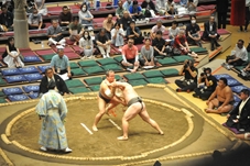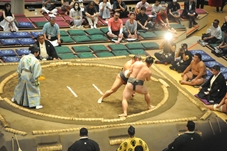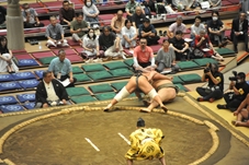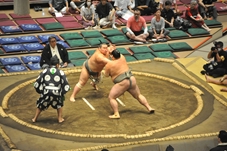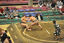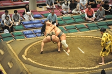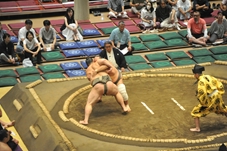 沖縄出身の城間と種子島出身の島津海は、年季の差が明らかに出た感じ。城間は左足を幾分引いて仕切り、右を固めてやや左に立った。 右四つなので作戦としては誤っていない。島津海は例の両差し狙いで当たり、少し黒房寄りに押し込んだ。城間左から小手捻り気味に引いて右を差そうとしたが、 島津海体を寄せて両差し、右に一気に出て青房に寄り倒した。