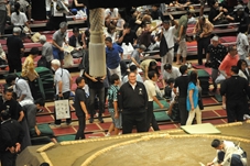 打ち出しとなるや否や、警備の親方衆がどんどん出てくる。正面のど真ん中には照ノ富士の伊勢ヶ濱さん。ちょうどこっちに向けて手を振ったように見えて、 なぜかみんなで大喜びしながら、ちゃんこ屋に向かったのだった。