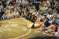 ![]() | ●金峰山(上手投げ)欧勝馬○ 金峰山両手で一突きしたが欧勝馬すぐに上体を下げて左上手、すぐさま体を廻して左上手投げで金峰山を黒房に投げ落とした。 |