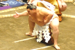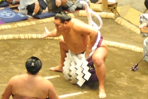不知火(諾)の錦絵は、拍手のあとに両手を開くという、後に常陸山がやった型とも考えられ、いずれとも断定できず、 結局は水掛け論に終わる以外に道はないらしい。解決しようのない不毛の論議は置いておいて、土俵入りの型は各人かなり異なっているというのに、「雲龍型」「不知火型」だけで括ってよいものかどうかという疑問を何とかしたい。 「雲龍型」はせり上がりの際に、腰を割って左手をわき腹に当て、右腕を右前方へ流す形を取り、そこからせり上がる型を総称しているが、そこには常陸山が含まれていない。 常陸山の型も、せり上がりだけを見るとれっきとした「雲龍型」なのであるが、なぜか「雲龍型」横綱としては扱われない。理由は単純で、 常陸山は土俵中央拍手を二度打ってから、両腕を広げて掌を返すという「破格」をやっていたからである((十九)項参照)。 常陸山の型がこの違いで雲龍型に入れられていないのに、後世にかなり変わってきた型(この件も後述)が「雲龍型」として数えられるというのは奇怪なことだと思うのである。 「…型」と各人が潔く言えばそれで済む話である。逆に、今誰かが常陸山の型を突然復活させたら、何型になるのだろうか。 さて、残る話は、「三段構えの基本」と彦山氏が称したものについてである。現在、「雲龍型」の土俵入りは、曲げている左腕は守りを、伸ばしている右腕は攻めを表すとされる。 「不知火型」は両腕とも伸ばしているので、攻め一辺倒の意志を強調するということになっている。 これが大嘘も大嘘、真の嘘っぱちであることは、有名な話である。「相撲」昭和56年 2月号「しつぎおうとう」欄の池田雅雄氏の回答を途中から引用すると、 「戦時中のこと、北京で皇軍慰問の巡業があり、そのとき羽黒山の土俵入りを見たある将軍が、笠置山(先代秀ノ山)に、あの型は双葉山と違うが、どういう意味があるのかと質問され、 知恵者の笠置山はとっさに「あれは不知火型といい両手を前に差し出すのは、攻撃型であり、双葉山の左手を胸に当てるのは、守りであり、伸ばした手を攻めを表わし、攻防の型を示しています」と戦時中らしく説明すると、将軍は満足してうなずいたそうです。 これを当時協会嘱託の彦山光三氏に話したところが、それはいいことを聞いたと、以後このことを強調するようになって、今のように流布してしまったと、のちの秀ノ山親方は筆者に苦笑し告白してくれました。 相撲故実というのは、のちにコジツケたことが多く、これもその一例で、深い意味はありません。 吉葉山が現役時代に「ワシの不知火型は、攻撃ばかりで邪道だと彦山氏がいうが、ほんとうか」と筆者に心配してたずねたことがあり、 そのいわれはまったくタワイのないことから出たのだと、秀ノ山親方の話を伝えて、「邪道でない」と説明し、安心させたことがあります。今でもこの虚説を鵜飲みにして書く人もいますがナンセンスな話です」とのことである。 理屈で考えたって分かりそうなものだ。上段・中段・下段のうち中段と下段で攻防の型を示しているものが、片腕ずつに攻防を配するなど全くバカバカしい。